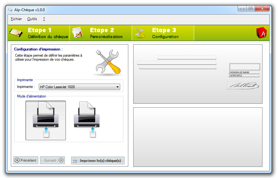 Alp-Cheque est un logiciel qui permet de se simplifier la vie en vous permettant d'imprimer des chèques. Avec cet outil vous pourrez éditer simplement tous vos règlements en quelques clics de manière professionnelle.