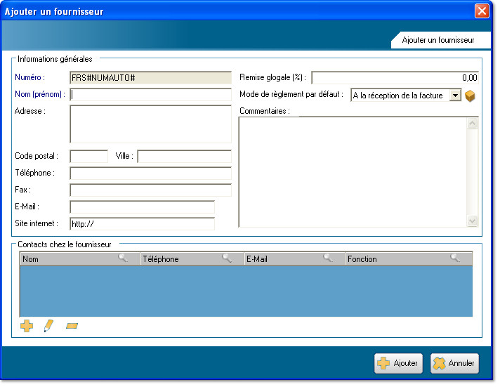 Le programme permet de gérer la liste de ses fournisseurs. Dans la fenêtre d'ajout d'un fournisseur vous pouvez saisir toutes les informations concernant votre fournisseur.